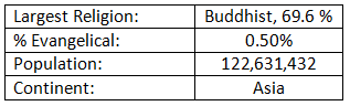 - There are 24 cities in Japan with no church at all. Pray for a church planting movement that will penetrate these unreached areas.