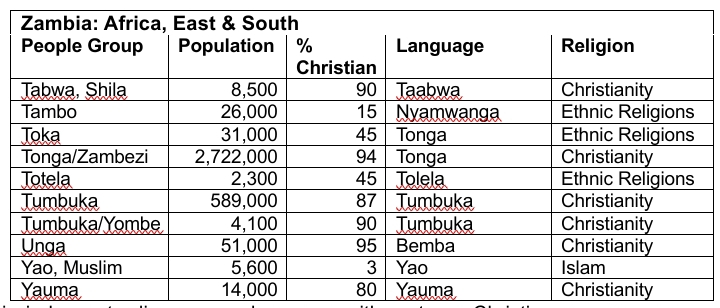 Zambia is home to diverse people groups with a strong Christian presence among many, such as the Tonga/Zambezi, Unga, Tumbuka, and Tabwa, where Christianity is well established. However, several groups still follow ethnic religions or Islam, including the Tambo, Toka, Totela, and Yao (Muslim), with low or moderate Christian representation. This spiritual diversity highlights both the fruit of past evangelistic efforts and the continuing need for discipleship, Bible teaching, and outreach so that all people groups may come to the saving knowledge of Jesus Christ.