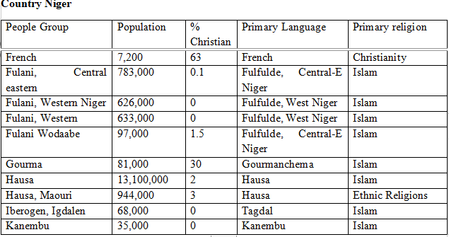 - Pray that Christians in this part of Niger will learn to cooperate with the Holy Spirit as He sends them to minister to these people groups.