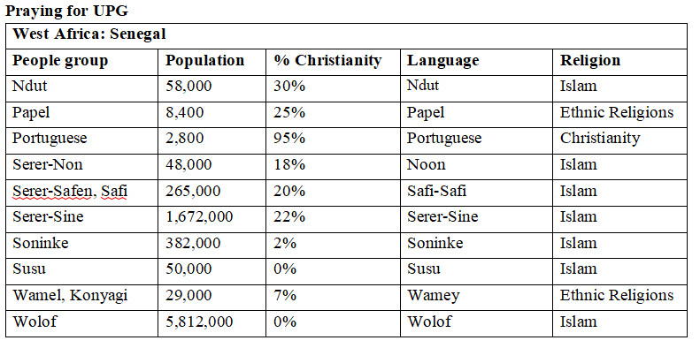 - Pray that the Lord will send laborers to minister in Senegal especially in communities dominated by Muslims.
