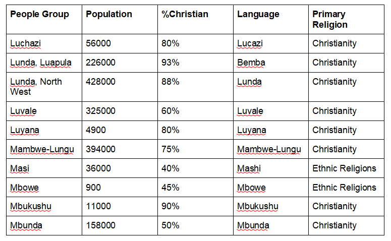 - These people groups are from Zambia which has a “young population” with almost half of the population under 15 years. Pray that God will raise up leaders to minister specifically to the young people in these people groups