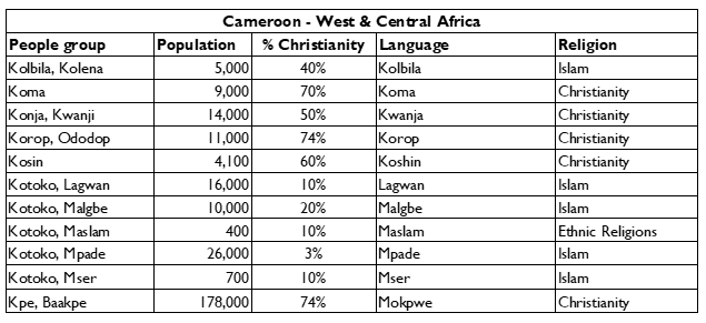 - Pray that Christians in Cameroon will become conscious of the work they have to reach out to the unreached people groups within their country.