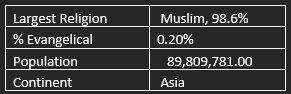 - The Iranian Diaspora is around four million. Diaspora Christians are highly active and generous regarding ministry into Iran and among other Iranians abroad; their contribution in this regard is crucial. Pray for the establishment of Diaspora churches.