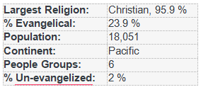 Christianity is generally professed, but nominalism is widespread, the most ardent Catholics being the Filipinos. Many older people are followers of the Modekngei movement, a religion unique to Palau that is a mixture of Christianity and magic; materialism and pluralism are the greater threats to the younger generation. Pray for the revival of the Koror Evangelical Church - the fruit of the work of the Liebenzell Mission. The AoG have a small but growing work.