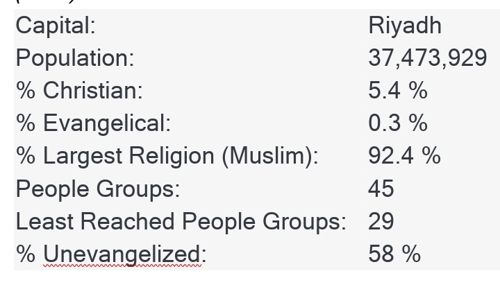 3. Pray for the safety and perseverance of Saudi believers who risk their lives to follow Christ. Ask God to protect them from persecution and that they may find ways to meet in safety, access God’s Word, and witness to others. Pray for a miracle that allows for the legalization of Christianity in Saudi Arabia.