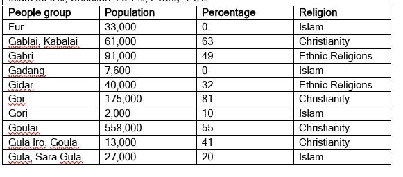 Chad: Population: 18,186,000; Total People Groups: 141; UPG: 80; Main Religion: Islam 56.9%; Christian: 25.7%; Evang. 7.3%