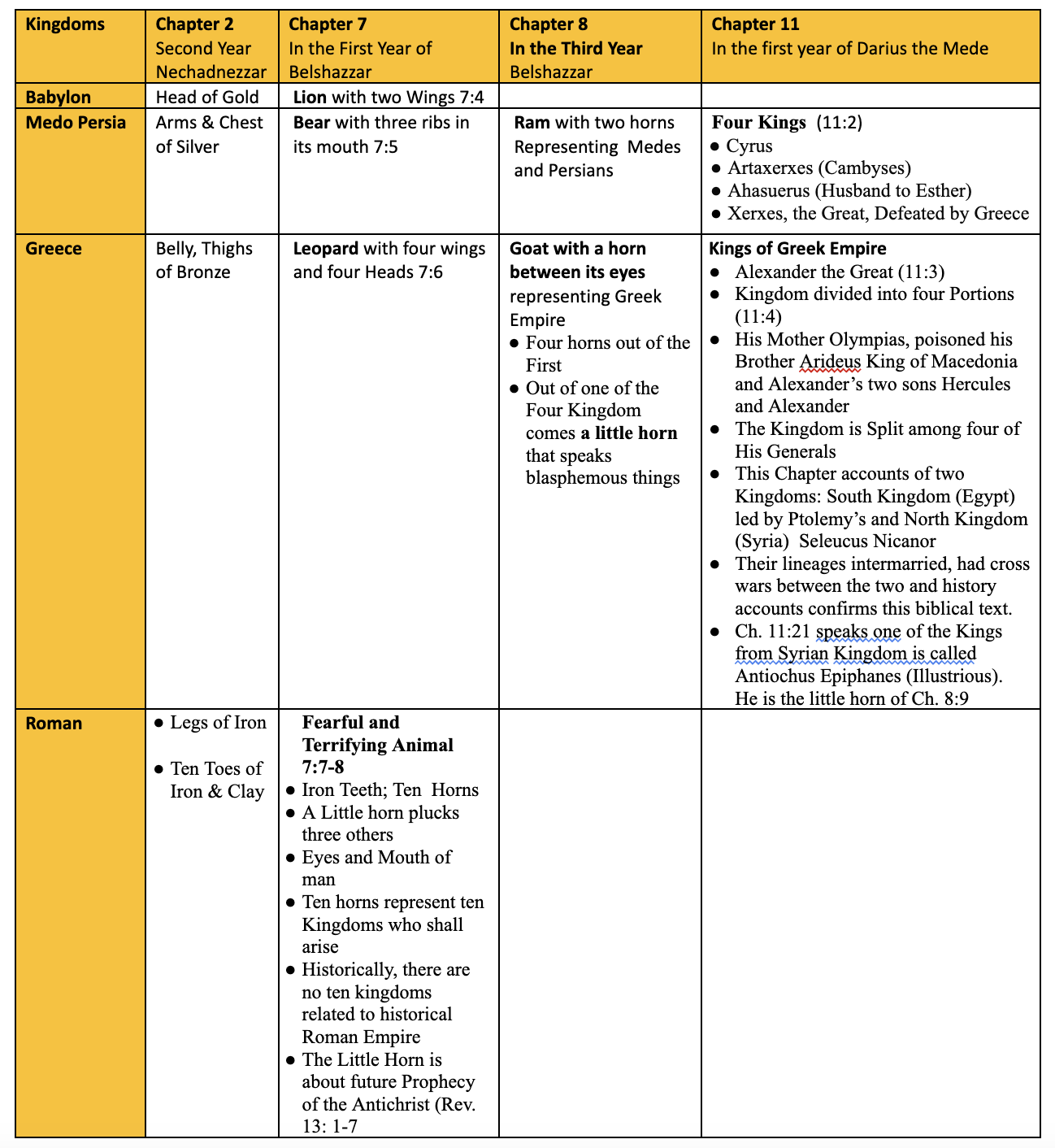 Daniel Chapter 11 is a unique text that is both complicated and prophetic. This is a detailed prophesy spanning a period of 370 Years that is thoroughly fulfilled in confounding many scholars. This is a text with so much detail about the Greek Empire given to Daniel before the foundation of that Empire. The text introduces the Greek Empire by mentioning in summary the names of the Kings of Persia. It then reveals that Alexander the Great, the one represented as a great horn on the Goat in the vision of Chapter 8 died and his kingdom split into four portions. Chapter 11 deals only with the two Kingdoms that are called Kingdom from the South and Kingdom from the North. History conforms details of Chapter 11 so much that some scholars think an historian who disguised it as prophetic wrote it. This Chapter clearly shows that God does not only know the future but He has it under His control