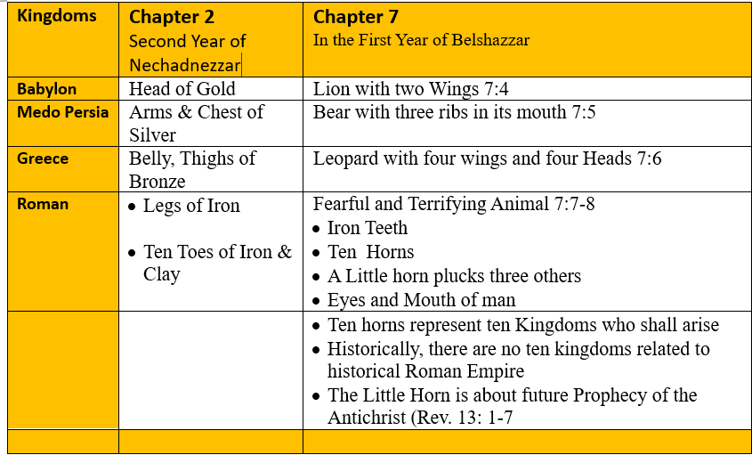 The mortal world will one day come to the end. Time as we know it, will stop. Eternity, which is timeless, will swallow the passage of time. Daniel Chapter 7 shows that the changes that happen in the human order do not change the eternal order. Instead, the narrative in Daniel shows that God’s eternal kingdom will one day take over the human political order. What Daniel sees is the rise in succession of powerful kingdoms. One significant aspect is that God reveals this information through a dream. The Book of Daniel has the Dreams as the main form of communication to Kings and Daniel.